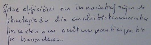 Juni 2011. Het lopende onderzoek naar een nieuwe vorm van participatie in de architectuur heeft als tussenresultaat een concept essay. Deze is hier te downloaden.